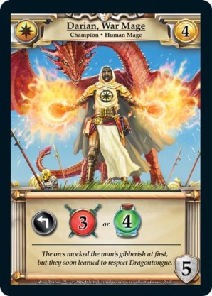 | Base Set | 1 | Darian, War Mage | {Expend}: {Gain 3 combat} or {Gain 4 health} | Champion ◆ Human Mage | Imperial | 4 | 5 | Market Deck | Hannes Radke | |||