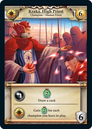 | Base Set | 1 | Kraka, High Priest | {Expend}: {Gain 2 health} Draw a card. {Imperial Ally}: Gain {2 health} for each champion you have in play. | Champion ◆ Human Priest | Imperial | 6 | 6 | Market Deck | Richard Hanuschek | |||