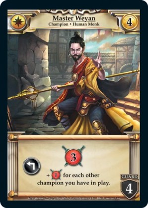 | Base Set | 1 | Master Weyan | {Expend}: {Gain 3 combat} +{1 combat} for each other champion you have in play. | Champion ◆ Human Monk | Imperial | 4 | 4 Guard | Market Deck | Simon Aan | |||