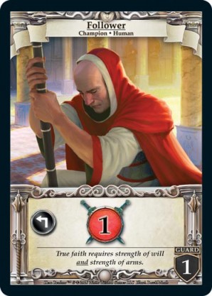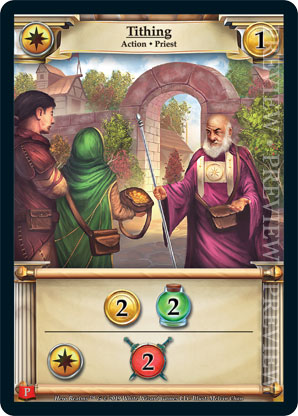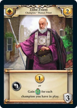 | Base Set | 2 | Tithe Priest | {Expend}: {Gain 1 gold} or Gain {1 health} for each champion you have in play. | Champion ◆ Human Priest | Imperial | 2 | 3 | Market Deck | Trevor Smith | |||