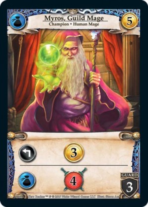 | Base Set | 1 | Myros, Guild Mage | {Expend}: {Gain 3 gold} {Guild Ally}: {Gain 4 combat} | Champion ◆ Human Mage | Guild | 5 | 3 Guard | Market Deck | Simon Aan | |||