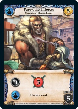 | Base Set | 1 | Parov, the Enforcer | {Expend}: {Gain 3 combat} {Guild Ally}: Draw a card. | Champion ◆ Human Rogue | Guild | 5 | 5 Guard | Market Deck | Gialer Liew | |||