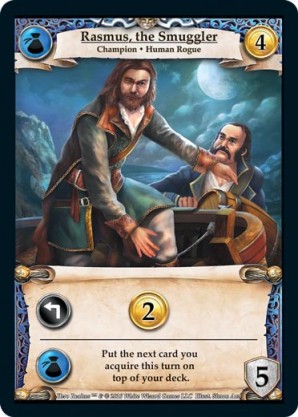 | Base Set | 1 | Rasmus, the Smuggler | {Expend}: {Gain 2 gold} {Guild Ally}: Put the next card you acquire this turn on top of your deck. | Champion ◆ Human Rogue | Guild | 4 | 5 | Market Deck | Simon Aan | |||