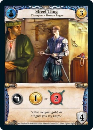 | Base Set | 2 | Street Thug | {Expend}: {Gain 1 gold} or {Gain 2 combat} | Champion ◆ Human Rogue | Guild | 3 | 4 | Market Deck | Dylan Safford | |||