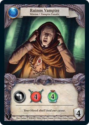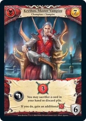 | Base Set | 1 | Krythos, Master Vampire | {Expend}: {Gain 3 combat} You may sacrifice a card in your hand or discard pile. If you do, gain an additional {3 combat}. | Champion ◆ Vampire | Necros | 7 | 6 | Market Deck | Apsara | |||