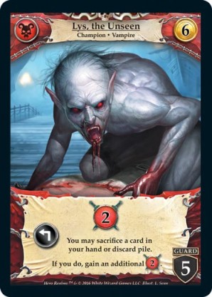 | Base Set | 1 | Lys, the Unseen | {Expend}: {Gain 2 combat} You may sacrifice a card in your hand or discard pile. If you do, gain an additional {2 combat}. | Champion ◆ Vampire | Necros | 6 | 5 Guard | Market Deck | L. Sean | |||
