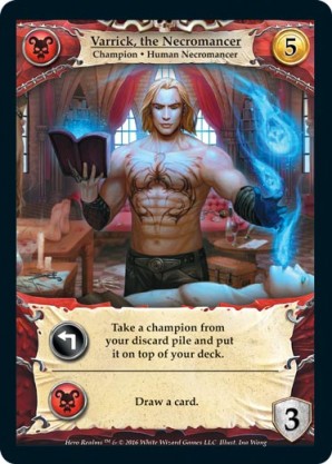 | Base Set | 1 | Varrick, the Necromancer | {Expend}: Take a champion from your discard pile and put it on top of your deck. {Necros Ally}: Draw a card. | Champion ◆ Human Necromancer | Necros | 5 | 3 | Market Deck | Ina Wong | |||
