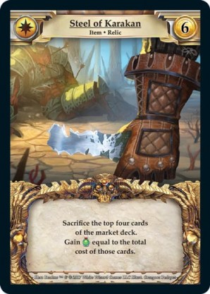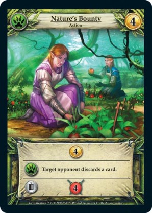 | Base Set | 1 | Nature's Bounty | {Gain 4 gold} {Wild Ally}: Target opponent discards a card. {Sacrifice}: {Gain 4 combat} | Action | Wild | 4 | Market Deck | Souveraine | ||||