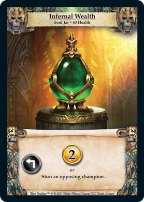 | Boss Deck: Lich | 1 | Infernal Wealth | {Expend}: {Gain 2 gold} or Stun an opposing champion. | Soul Jar ◆ 40 Health | Soul Jar | Apsara | ||||||