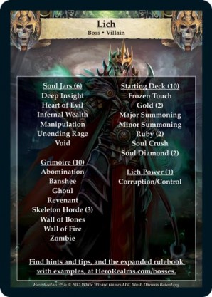 | Boss Deck: Lich | 1 | Unending Rage | {Expend}: {Gain 7 combat} It’s dangerous to release anger that’s been bottled up for centuries. | Soul Jar ◆ 55 Health | Soul Jar | Apsara | ||||||