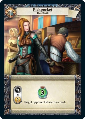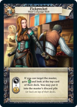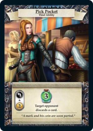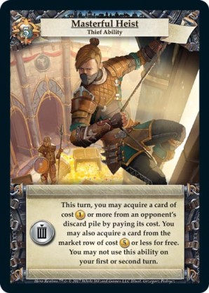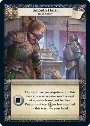 | Base Set | 1 | Smash and Grab | {Gain 6 combat} You may put a card from your discard pile on top of your deck. | Action ◆ Rogue | Guild | 6 | Market Deck | L. Sean | ||||