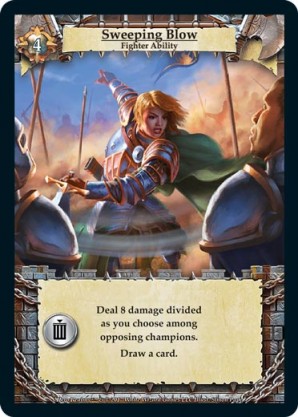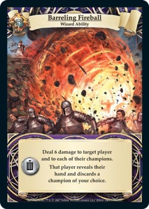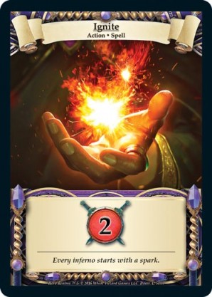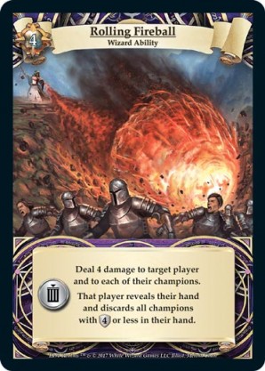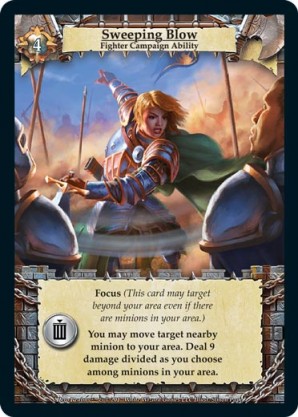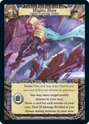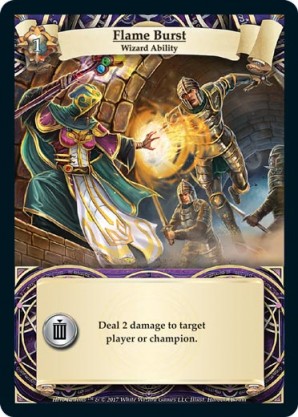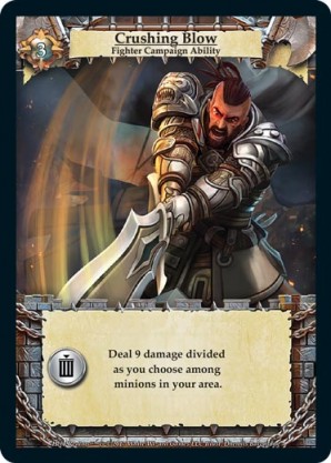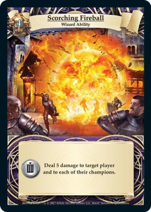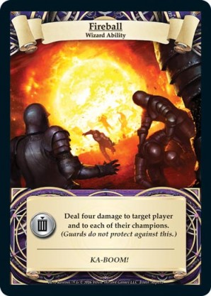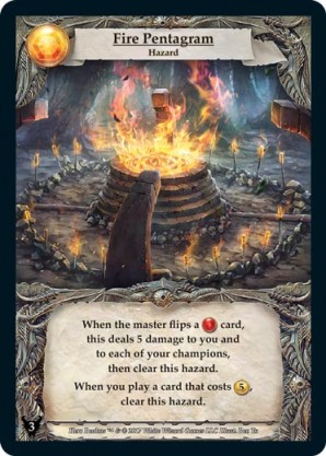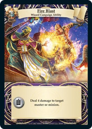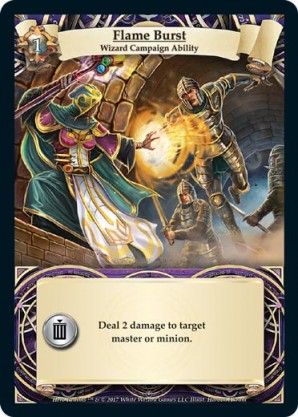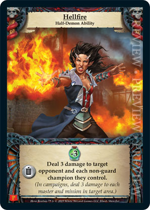 | Journeys Kickstarter Promo Pack | 1 | Hellfire | {Sacrifice}: {Lose 3 health} Deal 3 damage to target opponent and each non-guard champion they control. In campaigns, deal 3 damage to each master and minion in target area.) | Half-Demon Ability | Ability | Shen Fei | ||||||