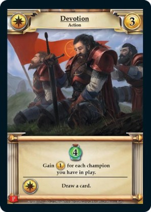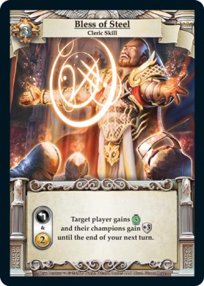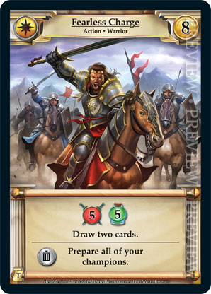 | Journeys: Travelers | 1 | Fearless Charge | {Gain 5 combat} {Gain 5 health} Draw two cards. {Sacrifice}: Prepare all of your champions. | Action ◆ Warrior | Imperial | 8 | Market Deck | Apsara | ||||