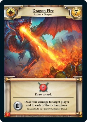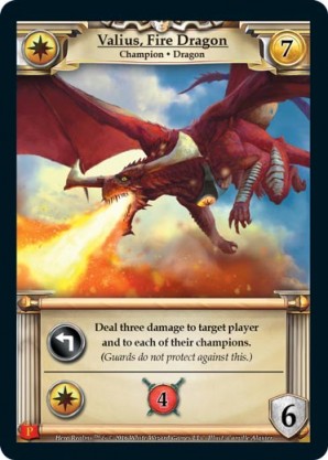 | 1st Kickstarter Promo Pack | 1 | Valius, Fire Dragon | {Expend}: Deal three damage to target player and to each of their champions. (Guards do not protect against this.) {Imperial Ally}: {Gain 4 combat} | Champion ◆ Dragon | Imperial | 7 | 6 | Market Deck | Camille Alquier | |||