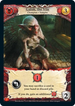 | 1st Kickstarter Promo Pack | 1 | Galok, the Vile | {Expend}: {Gain 1 combat} You may sacrifice a card in your hand or discard pile. If you do, gain an additional {1 combat}. | Champion ◆ Vampire | Necros | 3 | 2 | Market Deck | Inkognit | |||