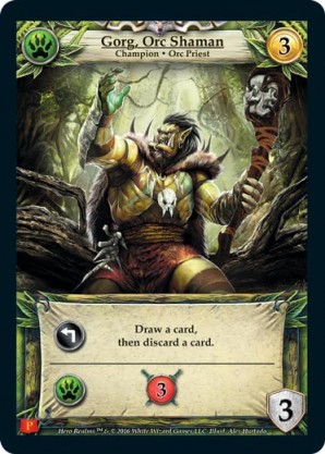 | 1st Kickstarter Promo Pack | 1 | Gorg, Orc Shaman | {Expend}: Draw a card, then discard a card. {Wild Ally}: {Gain 3 combat} | Champion ◆ Orc Priest | Wild | 3 | 3 | Market Deck | Alex Hurtado | |||