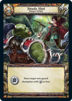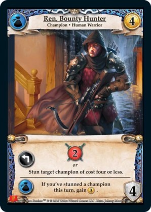 | 1st Kickstarter Promo Pack | 1 | Ren, Bounty Hunter | {Expend}: {Gain 2 combat} or Stun target champion of cost four or less. {Guild Ally}: If you’ve stunned a champion this turn, gain {3 gold}. | Champion ◆ Human Warrior | Guild | 4 | 4 | Market Deck | Johnny Morrow | |||
