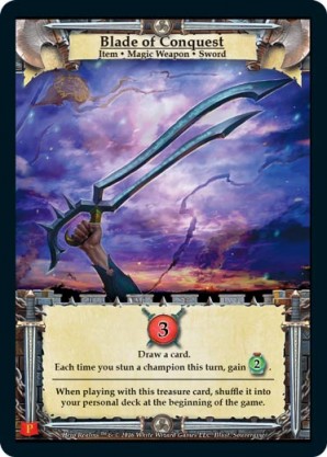 | 1st Kickstarter Promo Pack | 1 | Blade of Conquest | {Gain 3 combat} Draw a card. Each time you stun a champion this turn, gain {2 health}. When playing with this treasure card, shuffle it into your personal deck at the beginning of the game. | Item ◆ Magic Weapon ◆ Sword | Fighter Personal Deck | Souveraine | ||||||