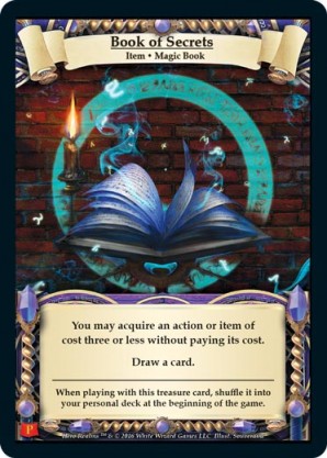 | 1st Kickstarter Promo Pack | 1 | Book of Secrets | You may acquire an action or item of cost three or less without paying its cost. Draw a card. When playing with this treasure card, shuffle it into your personal deck at the beginning of the game. | Item ◆ Magic Book | Wizard Personal Deck | Souveraine | ||||||
