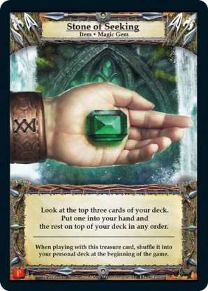 | 1st Kickstarter Promo Pack | 1 | Stone of Seeking | Look at the top three cards of your deck. Put one into your hand and the rest on top of your deck in any order. When playing with this treasure card, shuffle it into your personal deck at the beginning of the game. | Item ◆ Magic Gem | Ranger Personal Deck | Apsara | ||||||