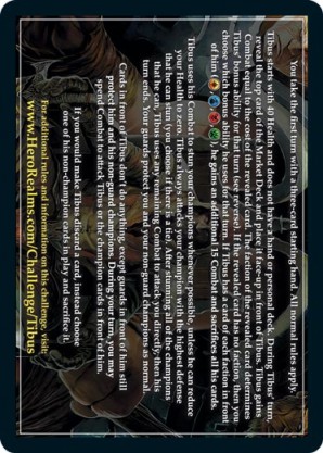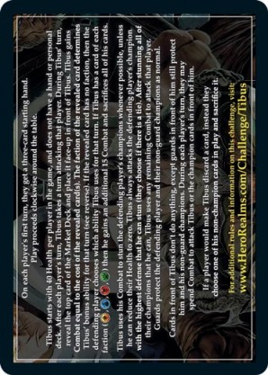 | 1st Kickstarter Promo Pack, The Lost Village | 1 | Tibus, Guild Lord | {Imperial Ally}: Tibus gains {5 health}. {Guild Ally}: Tibus keeps the revealed card, and reveals another. {Necros Ally}: Sacrifice every card in the market. Tibus gains {5 combat}. {Wild Ally}: If you have any champions, Tibus stuns one. If not, discard two cards. | Co-op Challenge | Health 40 x Players | Challenge | Alex Hurtado | |||||