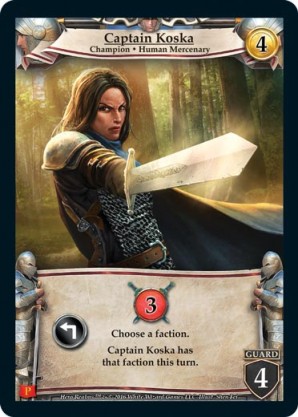 | Promos (Domination Storage Box) | 1 | Captain Koska | {Expend}: {Gain 3 combat} Choose a faction. Captain Koska has that faction this turn. | Champion ◆ Human Mercenary | 4 | 4 Guard | Market Deck | Shen Fei | ||||