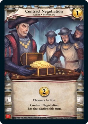 | Promos (Convention Promo) | 1 | Contract Negotiation | {Gain 2 gold} Choose a faction. Contract Negotiation has that faction this turn. | Action ◆ Mercenary | 1 | Market Deck | Melvin Chan | |||||