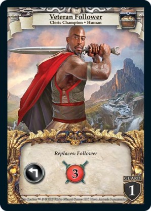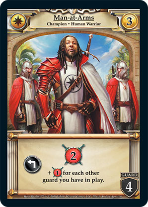 | Base Set | 2 | Man-at-Arms | {Expend}: {Gain 2 combat} +{1 combat} for each other guard you have in play. | Champion ◆ Human Warrior | Imperial | 3 | 4 Guard | Market Deck | This card was printed with new artwork in the second edition, as shown. | Richard Hanuschek | ||