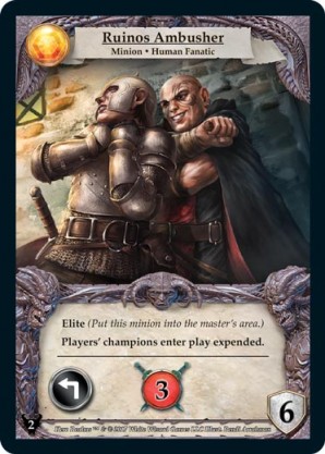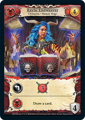 | Base Set | 1 | Rayla, Endweaver | {Expend}: {Gain 3 combat} {Necros Ally}: Draw a card. | Champion ◆ Human Mage | Necros | 4 | 4 | Market Deck | This card was printed with new artwork in the second edition, as shown. | Dimas Pamungkas | ||