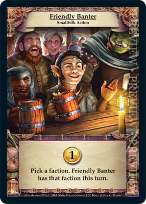 | Ancestry | 1 | Friendly Banter | {Gain 1 gold} Pick a faction. Friendly Banter has that faction this turn. | Smallfolk Action | Personal Deck | Jeffrey C. Viloria | ||||||