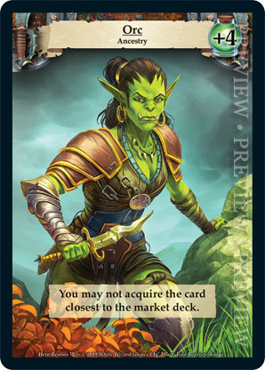 | Ancestry | 1 | Orc | You may not acquire the card closest to the market deck. | Ancestry | Health +4 | Avatar | Jean Baptiste Andrier | |||||