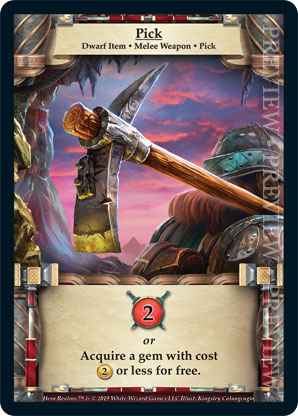 | Ancestry | 1 | Pick | {Gain 2 combat} or Acquire a gem with cost {2 gold} or less for free. | Dwarf Item ◆ Melee Weapon ◆ Pick | Personal Deck | Kingsley Calungcagin | ||||||