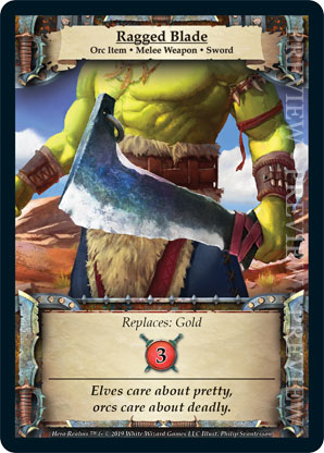 | Ancestry | 1 | Ragged Blade | Replaces: Gold {Gain 3 combat} | Orc Item ◆ Melee Weapon ◆ Sword | Personal Deck | Philip Svantesson | ||||||