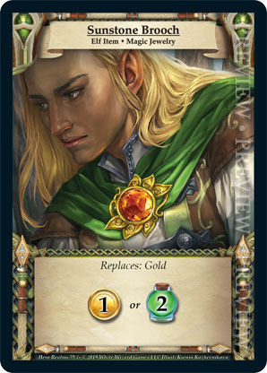 | Ancestry | 1 | Sunstone Brooch | Replaces: Gold {Gain 1 gold} or {Gain 2 health} | Elf Item ◆ Magic Jewelry | Personal Deck | Ksenia Kozhevnikova | ||||||