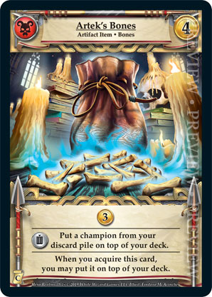 | Journeys: Conquest | 1 | Artek's Bones | {Gain 3 gold} {Sacrifice}: Put a champion from your discard pile on top of your deck. When you acquire this card, you may put it on top of your deck. | Artifact Item ◆ Bones | Necros | 4 | Artifact Deck | Findara McAvinchey | ||||