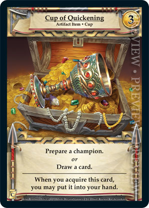 | Journeys: Conquest | 1 | Cup of Quickening | Prepare a champion. or Draw a card. When you acquire this card, you may put it into your hand. | Artifact Item ◆ Cup | 3 | Artifact Deck | Ksenia Kozhevnikova | |||||
