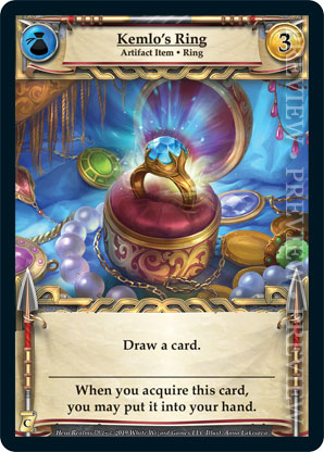 | Journeys: Conquest | 1 | Kemlo's Ring | Draw a card. When you acquire this card, you may put it into your hand. | Artifact Item ◆ Ring | Guild | 3 | Artifact Deck | Anna Lakisova | ||||