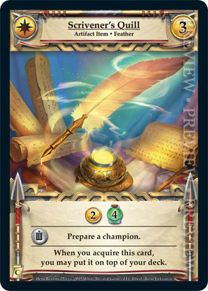 | Journeys: Conquest | 1 | Scrivener's Quill | {Gain 2 gold} {Gain 4 Health} {Sacrifice}: Prepare a champion. When you acquire this card, you may put it on top of your deck. | Artifact Item ◆ Feather | Imperial | 3 | Artifact Deck | Anna Lakisova | ||||