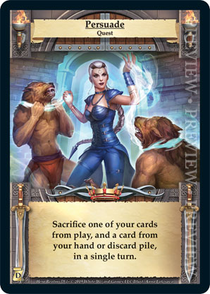 | Journeys: Discovery | 1 | Persuade | Sacrifice one of your cards from play, and a card from your hand or discard pile, in a single turn. | Quest | Quest Deck | Anna Lakisova | ||||||