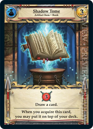 | Journeys: Discovery | 1 | Shadow Tome | {Gain 3 combat} Draw a card. When you acquire this card, you may put it on top of your deck. | Artifact Item ◆ Book | Guild | 3 | Artifact Deck | Olivier Bernard | ||||
