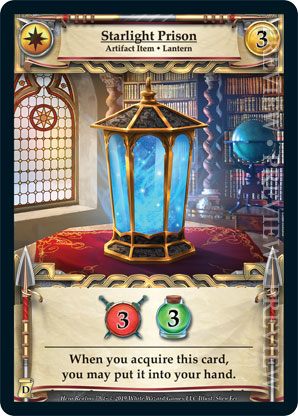 | Journeys: Discovery | 1 | Starlight Prison | {Gain 3 combat} {Gain 3 health} When you acquire this card, you may put into your hand. | Artifact Item ◆ Lantern | Imperial | 3 | Artifact Deck | Shen Fei | ||||
