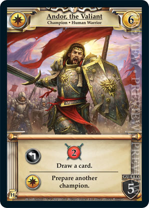 | Journeys: Hunters | 1 | Andor, the Valiant | {Expend}: {Gain 2 combat} Draw a card. {Imperial Ally}: Prepare another champion. | Champion ◆ Human Warrior | Imperial | 6 | 5 Guard | Market Deck | Olivier Bernard | |||