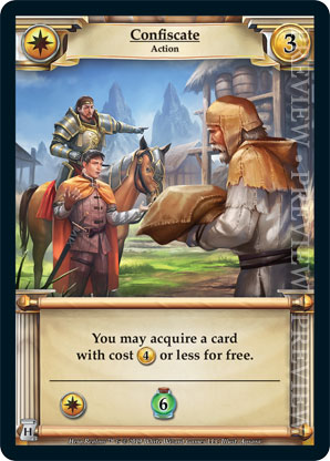 | Journeys: Hunters | 2 | Confiscate | You may acquire a card with cost {4 gold} or less for free. {Imperial Ally}: {Gain 6 health} | Action | Imperial | 3 | Market Deck | Apsara | ||||