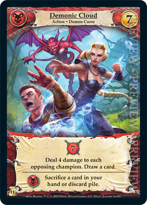 | Journeys: Hunters | 1 | Demonic Cloud | {Gain 7 combat} Deal 4 damage to each opposing champion. Draw a card. {Necros Ally}: Sacrifice a card in your hand or discard pile. | Action ◆ Demon Curse | Necros | 7 | Market Deck | Jessada Sutthi | ||||
