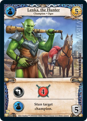 | Journeys: Hunters | 1 | Lenka, the Hunter | {Expend}: {Gain 4 combat} {Guild Ally}: Stun target champion. | Champion ◆ Ogre | Guild | 5 | 5 | Market Deck | Apsara | |||