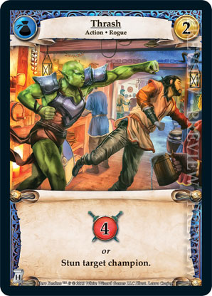 | Journeys: Hunters | 2 | Thrash | {Gain 4 combat} or Stun target champion. | Action ◆ Rogue | Guild | 2 | Market Deck | Laura Csajagi | ||||