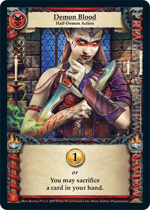 | Journeys Kickstarter Promo Pack | 1 | Demon Blood | {Gain 1 gold} or You may sacrifice a card in your hand. | Half-Demon Action | Necros | Personal Deck | Antonis Papantoniou | |||||