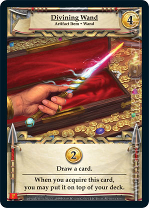 | Journeys Kickstarter Promo Pack | 1 | Divining Wand | {Gain 2 gold} Draw a card. When you acquire this card, you may put it on top of your deck. | Artifact Item ◆ Wand | 4 | Artifact Deck | Melvin Chan | |||||
