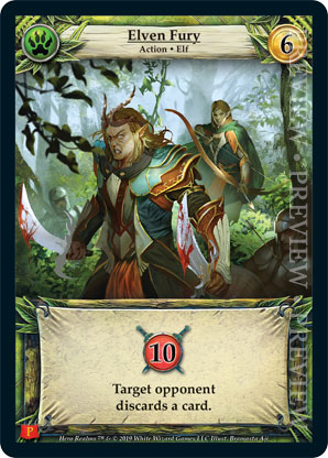 | Journeys Kickstarter Promo Pack | 1 | Elven Fury | {Gain 10 combat} Target opponent discards a card. | Action ◆ Elf | Wild | Market Deck | Bramasta Aji | |||||