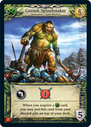 | Journeys Kickstarter Promo Pack | 1 | Gornok Spinebreaker | {Expend}: {Gain 4 combat} When you acquire a {Wild} card, you may put this card from your discard pile on top of your deck. | Champion ◆ Troll Warrior | Wild | 5 | 5 | Market Deck | L. Sean | |||